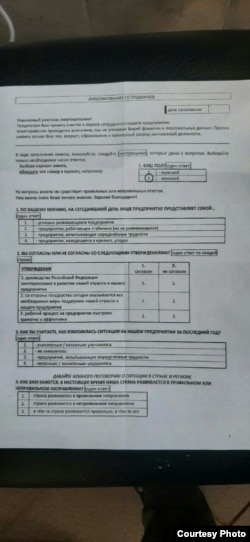 Сотрудник "Газпрома" из Ленского района Архангельской области также на условиях анонимности сообщил, что анкетирование проходило и у них: "Такая бумага была, в пятницу принесли, вчера уже забрали. Добровольно кто хотел, заполнял, многие вообще ее не видели", — уточнил он.
